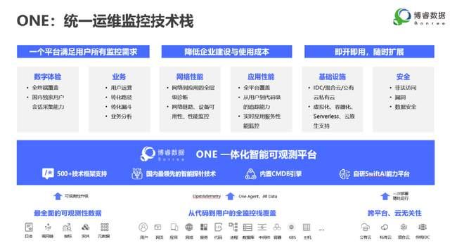 2022年5月20日,博睿数据正式推出了一体化智能可观测平台ONE,该平台旨在建立一体化、智能化、面向业务与用户体验的统一运维平台,助力企业提高数字化体验,降低运维成本,提升工作效率,为数字化转型赋能升级。同时,这也是业界第一个将所有运维监控需求“All in ONE”的统一平台。博睿数据的 AI 能力,比如告警收敛、根因分析、多维分析、影响分析等,也将在 ONE 平台的观测洞察、应急管理等模块中逐步落地。