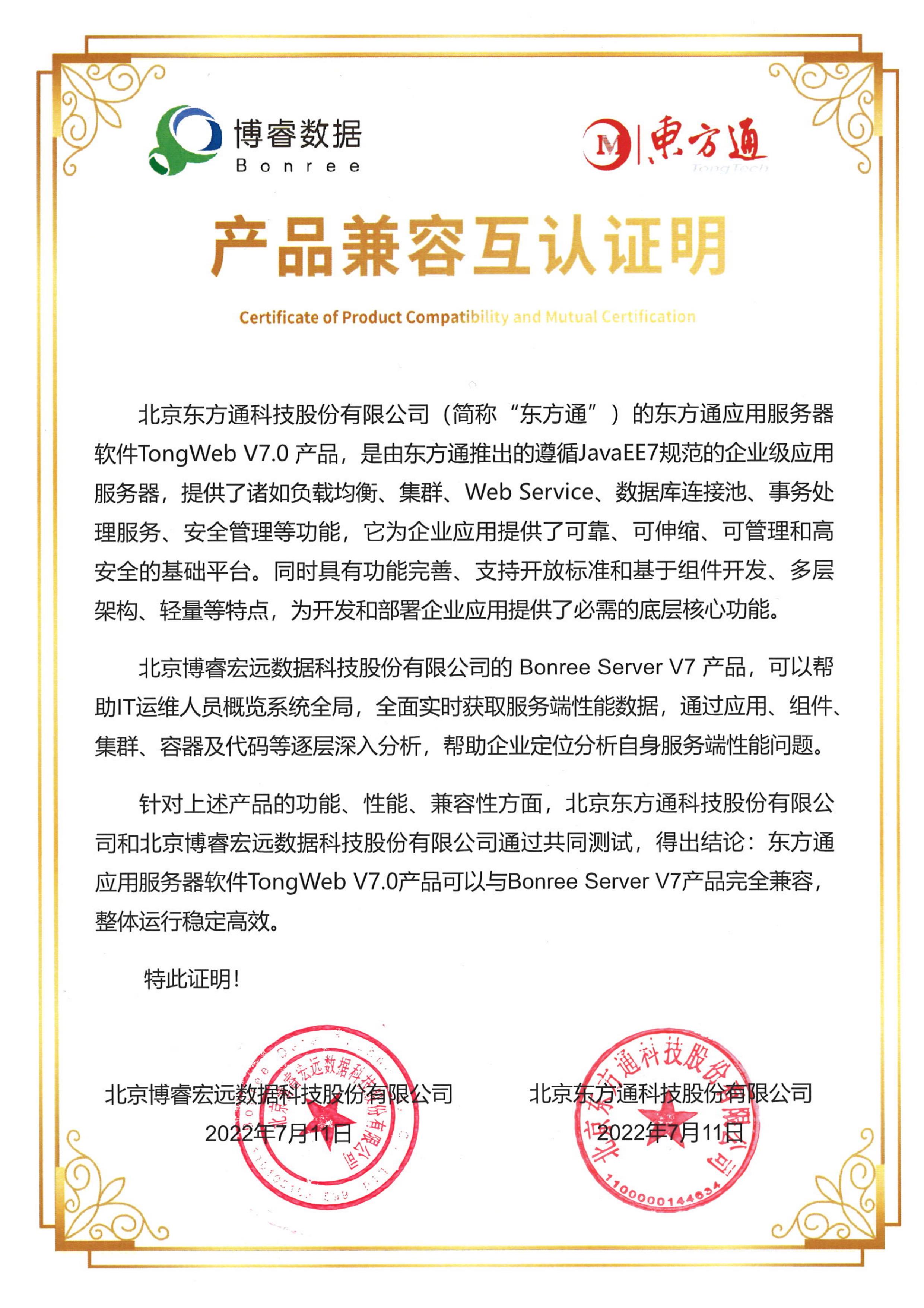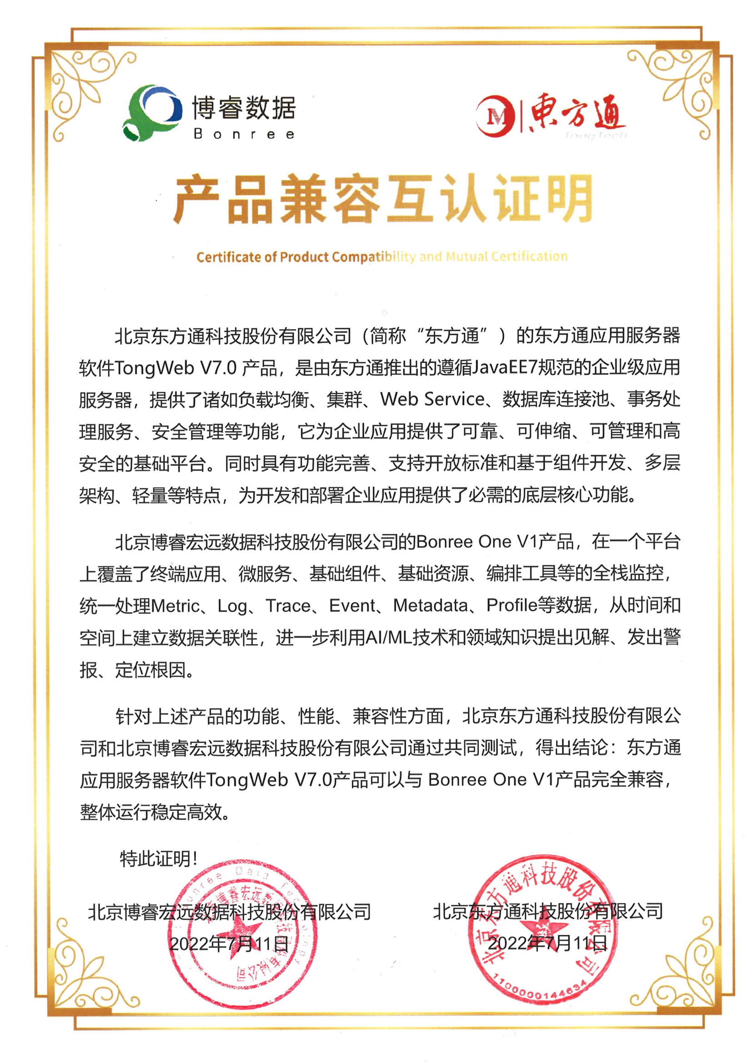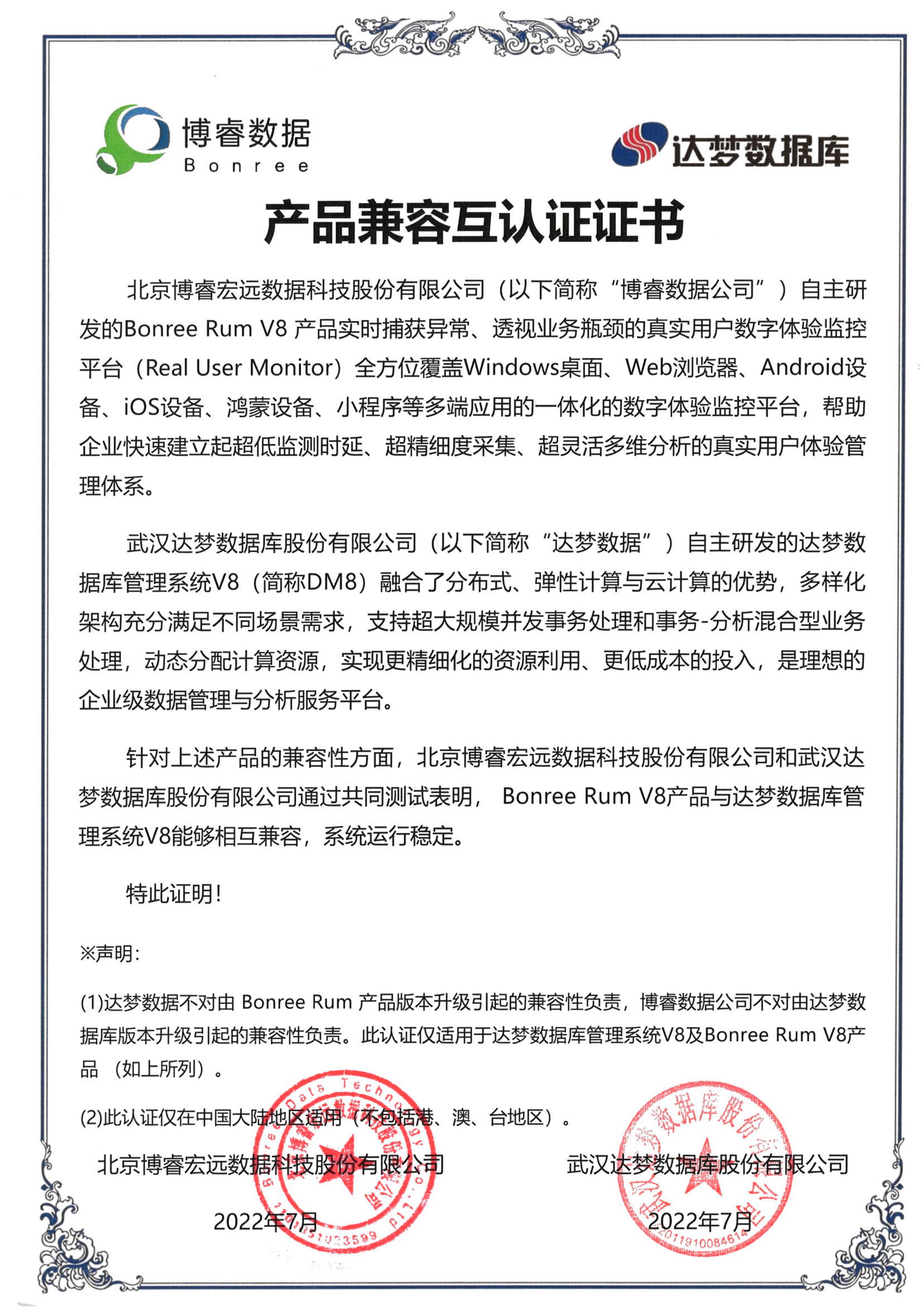 作为国内APM和可观测性的领军企业,博睿数据十分重视生态发展,并积极与芯片、操作系统、数据库、中间件、应用软件等生态厂商保持高度紧密的协同合作,以此不断完善产品性能,为客户提供更优质的产品和服务。此次博睿数据旗下Bonree Browser、Bonree Dataview、Bonree ONE、Bonree RUM、Bonree SDK、Bonree Server等多款产品与东方通应用服务器软件TongWeb V7.0以及达梦数据库管理系统V8完全兼容,不仅是基于产品功能和性能的测评认证,更是双方共同携手、持续创新,在信息技术应用创新产业生态发展中的不懈努力。