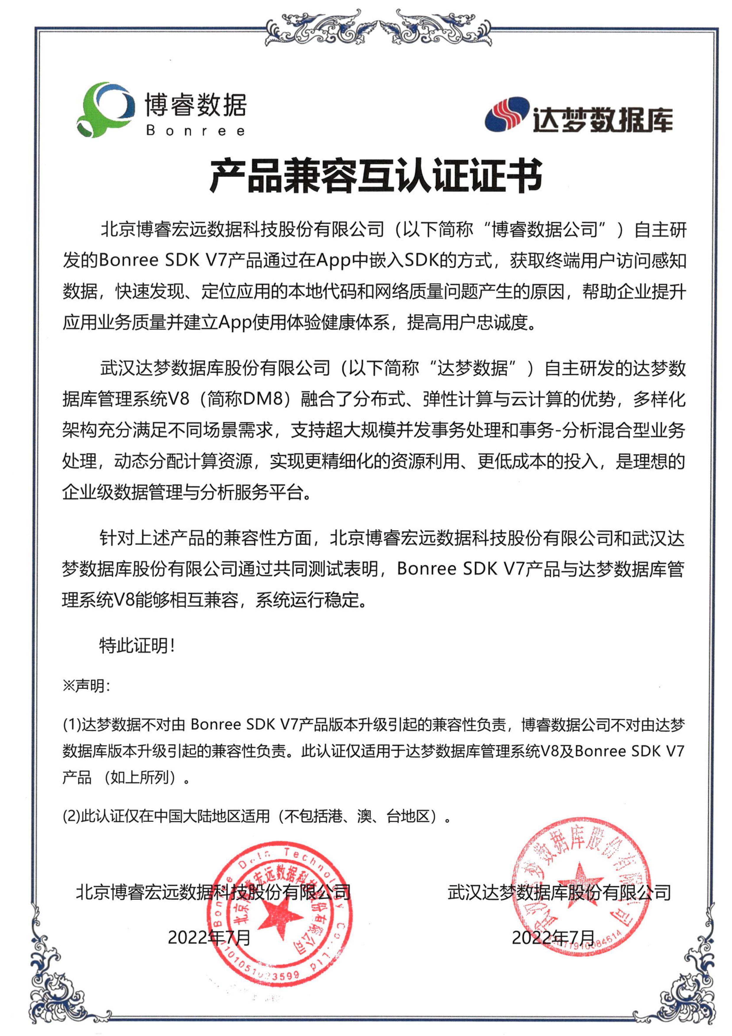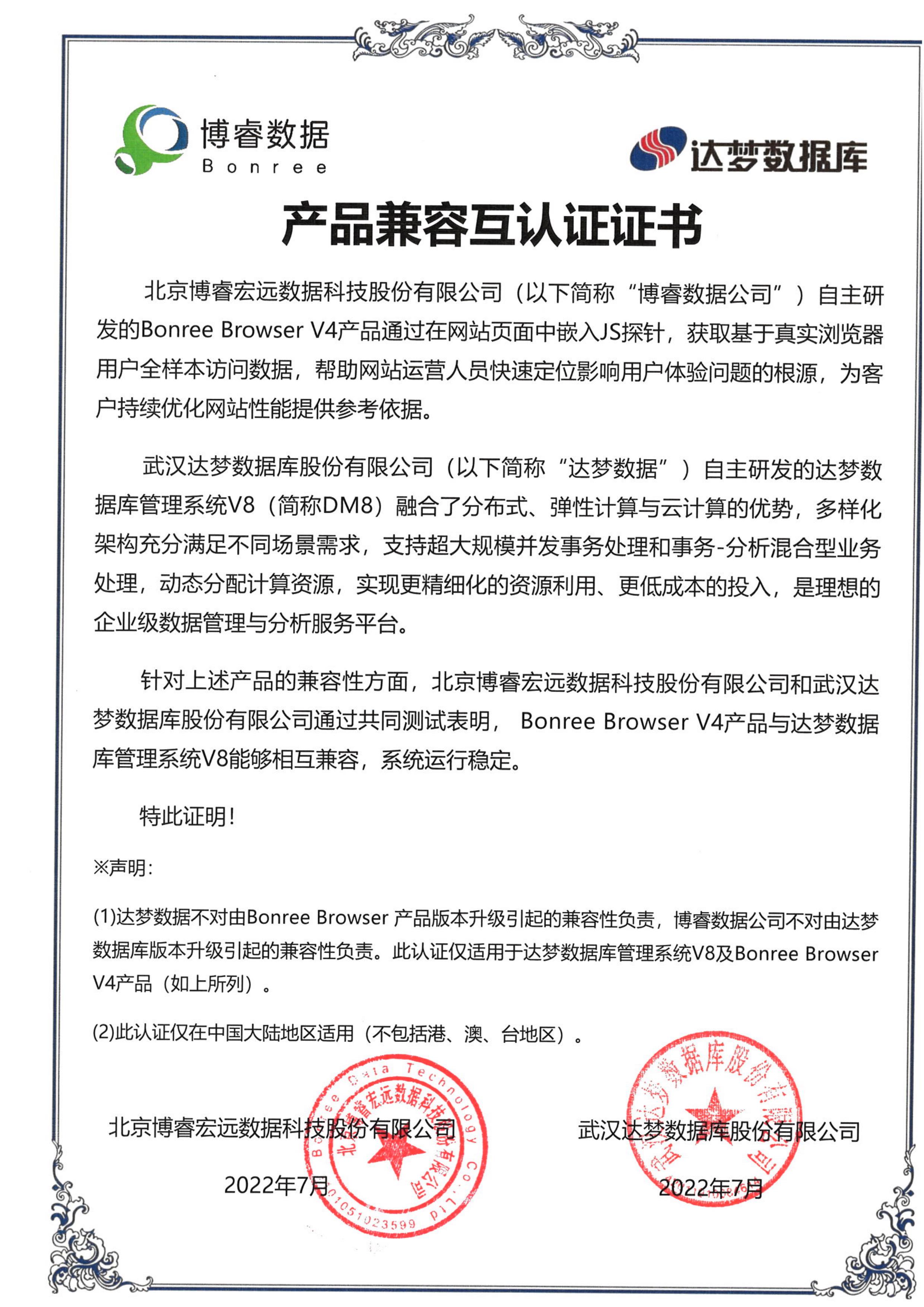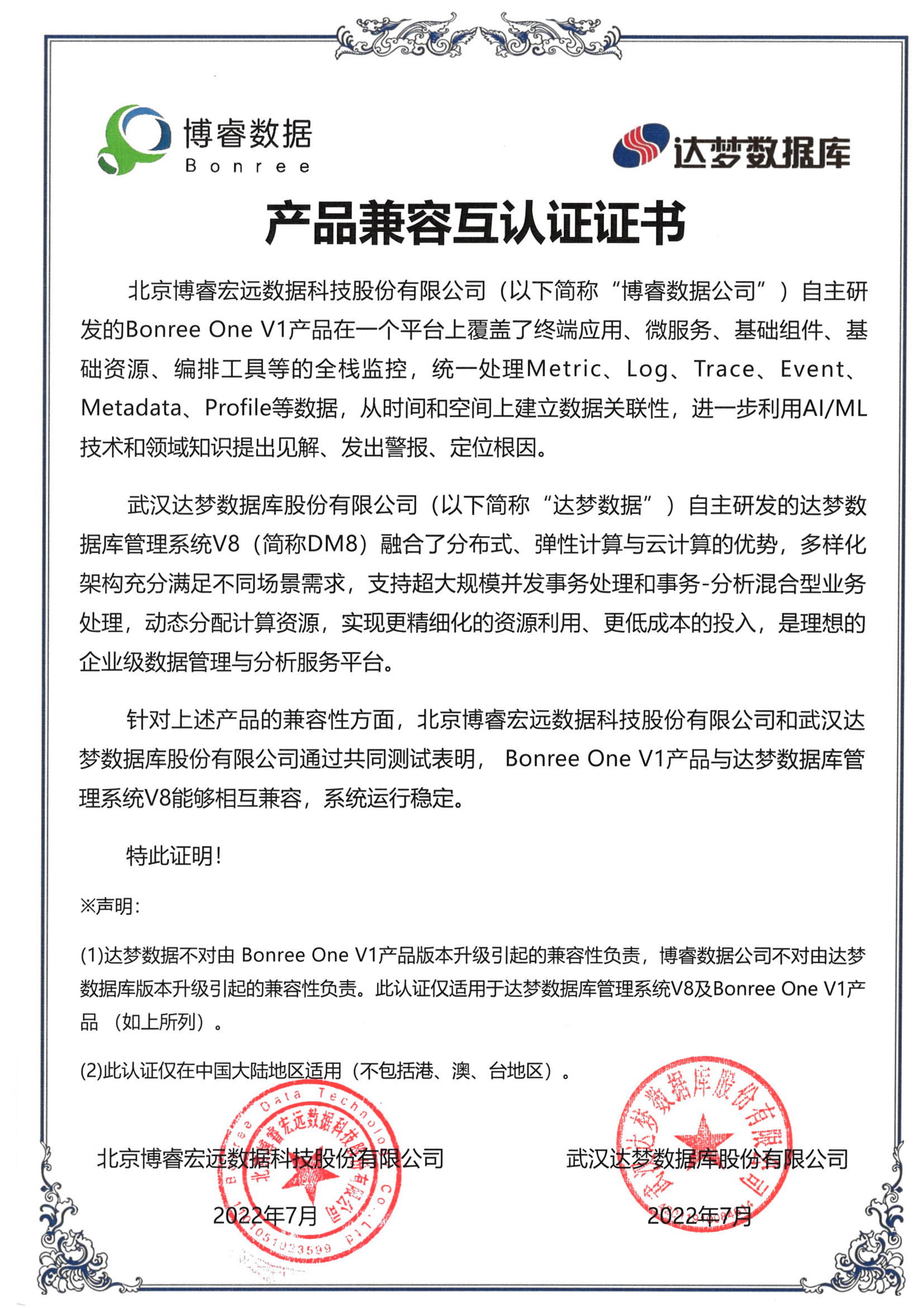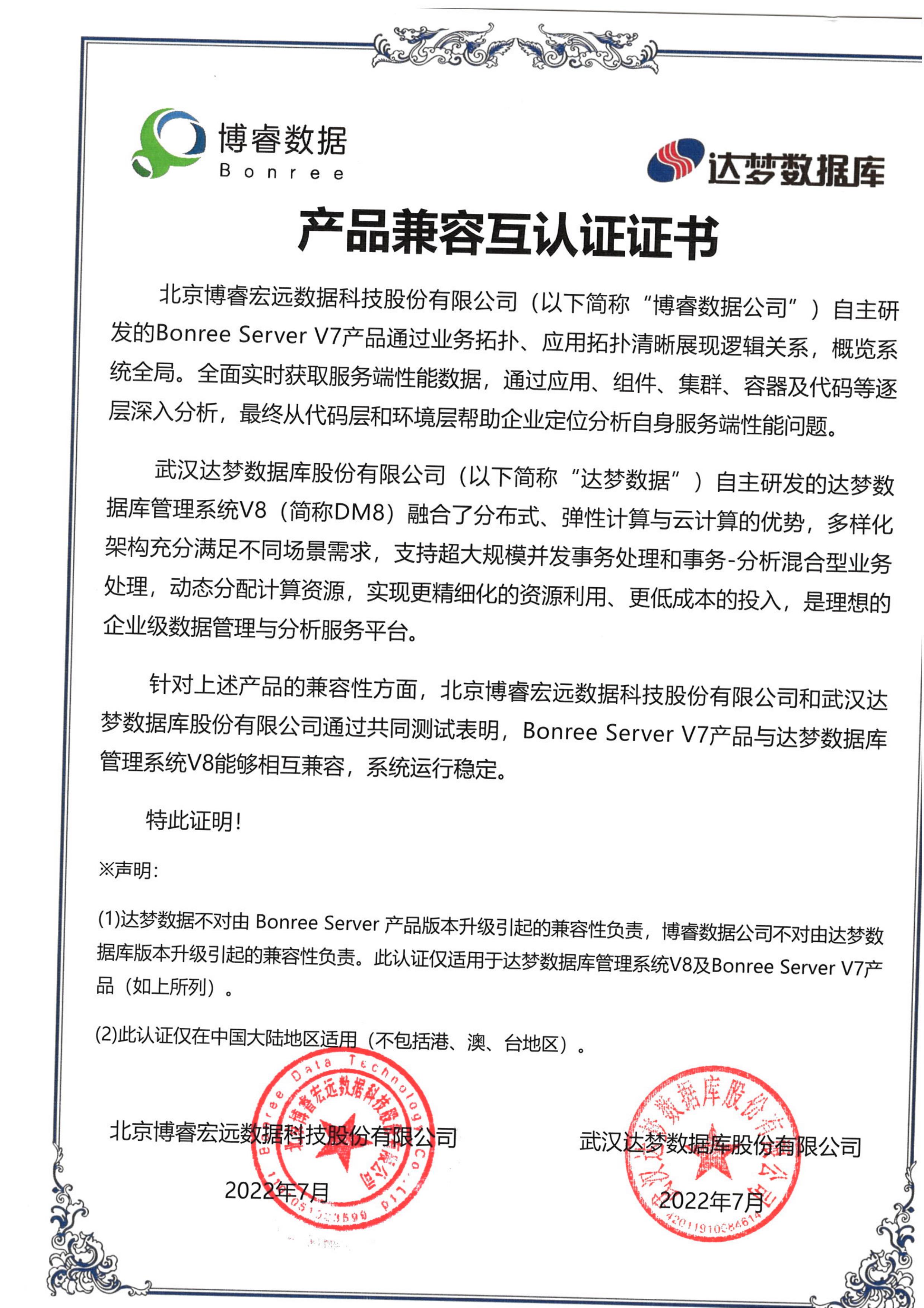 作为国内APM和可观测性的领军企业,博睿数据十分重视生态发展,并积极与芯片、操作系统、数据库、中间件、应用软件等生态厂商保持高度紧密的协同合作,以此不断完善产品性能,为客户提供更优质的产品和服务。此次博睿数据旗下Bonree Browser、Bonree Dataview、Bonree ONE、Bonree RUM、Bonree SDK、Bonree Server等多款产品与东方通应用服务器软件TongWeb V7.0以及达梦数据库管理系统V8完全兼容,不仅是基于产品功能和性能的测评认证,更是双方共同携手、持续创新,在信息技术应用创新产业生态发展中的不懈努力。