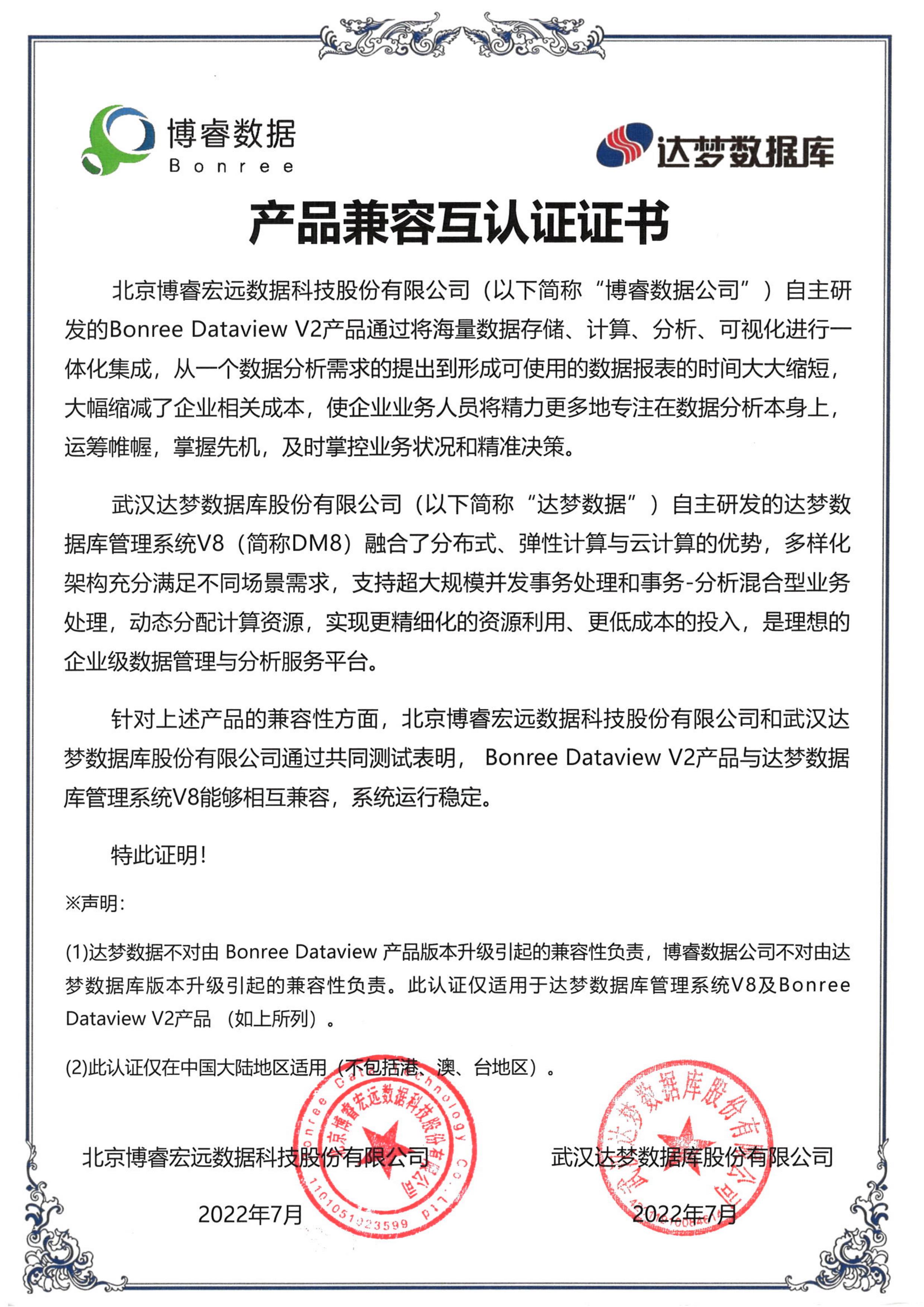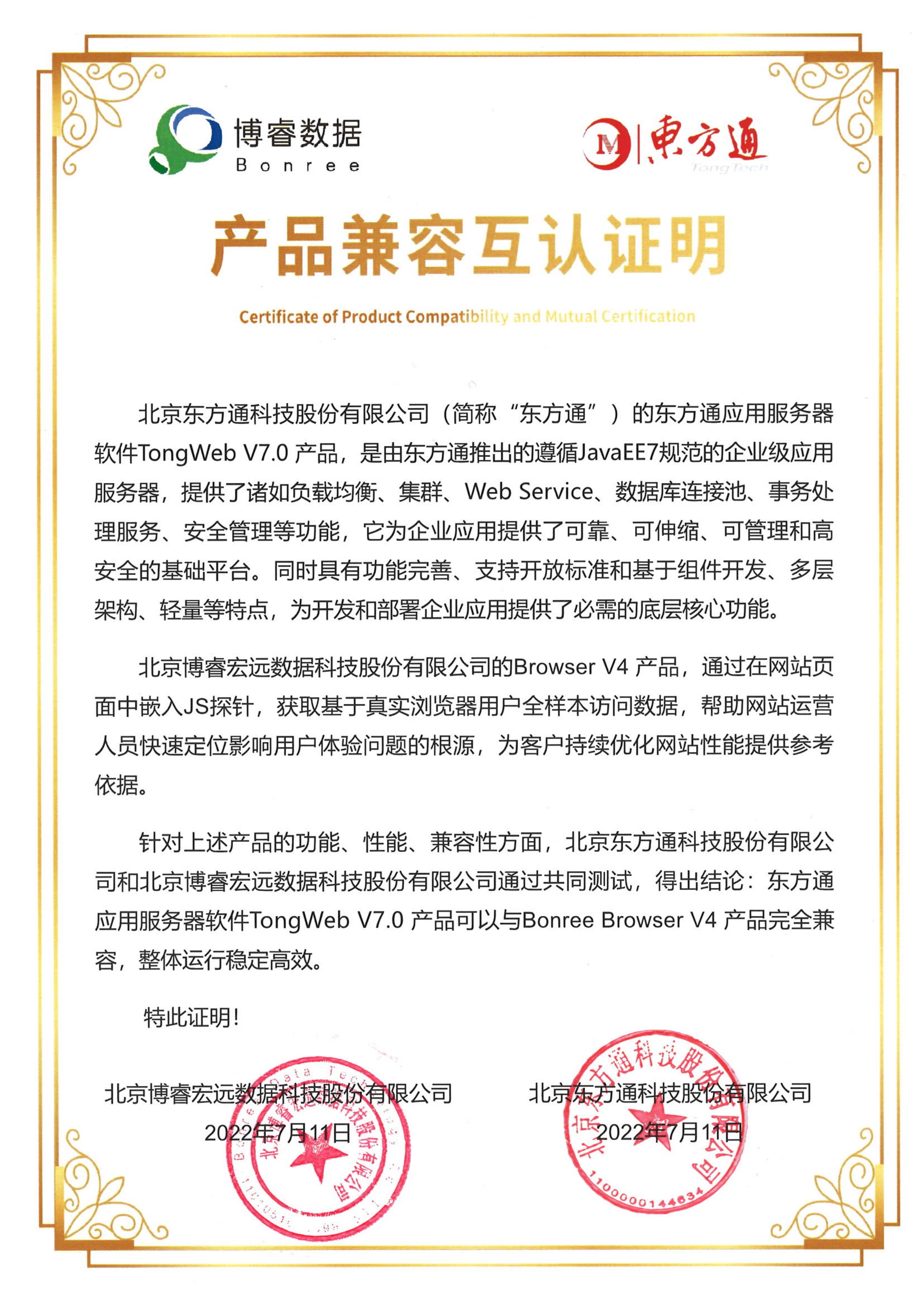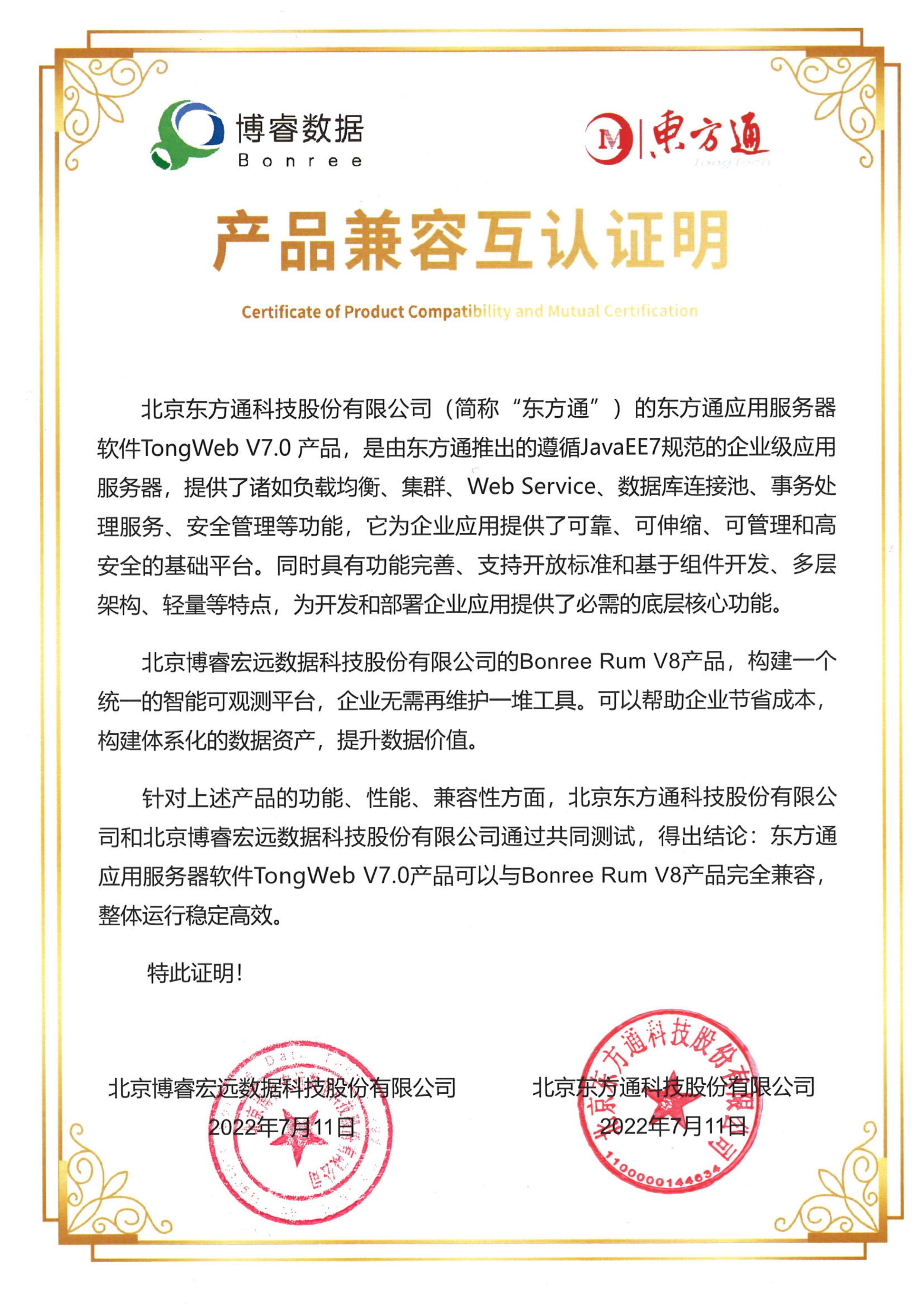 近日,博睿数据与东方通以及达梦数据完成产品兼容互认,博睿数据Bonree Browser、Bonree Dataview、Bonree ONE、Bonree RUM、Bonree SDK、Bonree Server等多款产品与东方通应用服务器软件TongWeb V7.0以及达梦数据库管理系统V8完全兼容,整体运行稳定高效。