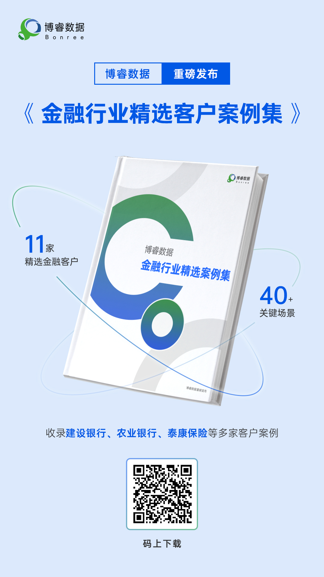 本案例集将近年博睿数据服务金融客户的精华内容进行汇总,案例集涵盖银行、证券、保险11家客户案例,收录建设银行、农业银行、泰康保险等多家客户可参考、可复制的最佳实践及精选获奖案例。扫描下方海报二维码,即刻获取整部案例集。